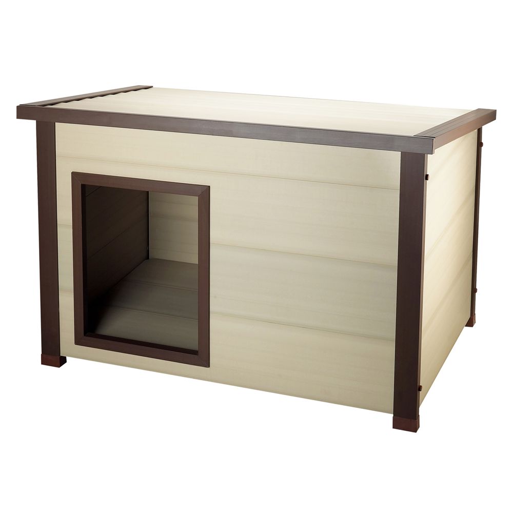 For dogs up to 150lbs. At chewy, we never feel like our pets are cramping our style. Thermocore insulation is sandwiched between inside and outside walls comprised of ecoflex. Flat roof, side door lodge style is perfect for pets that prefer to rest away from the door and/or like to sit on top of their house. New age pet ecoflex thermocore dog house the new age pet ecoflex thermocore dog house provides extreme insulation from hot and cold weather.
